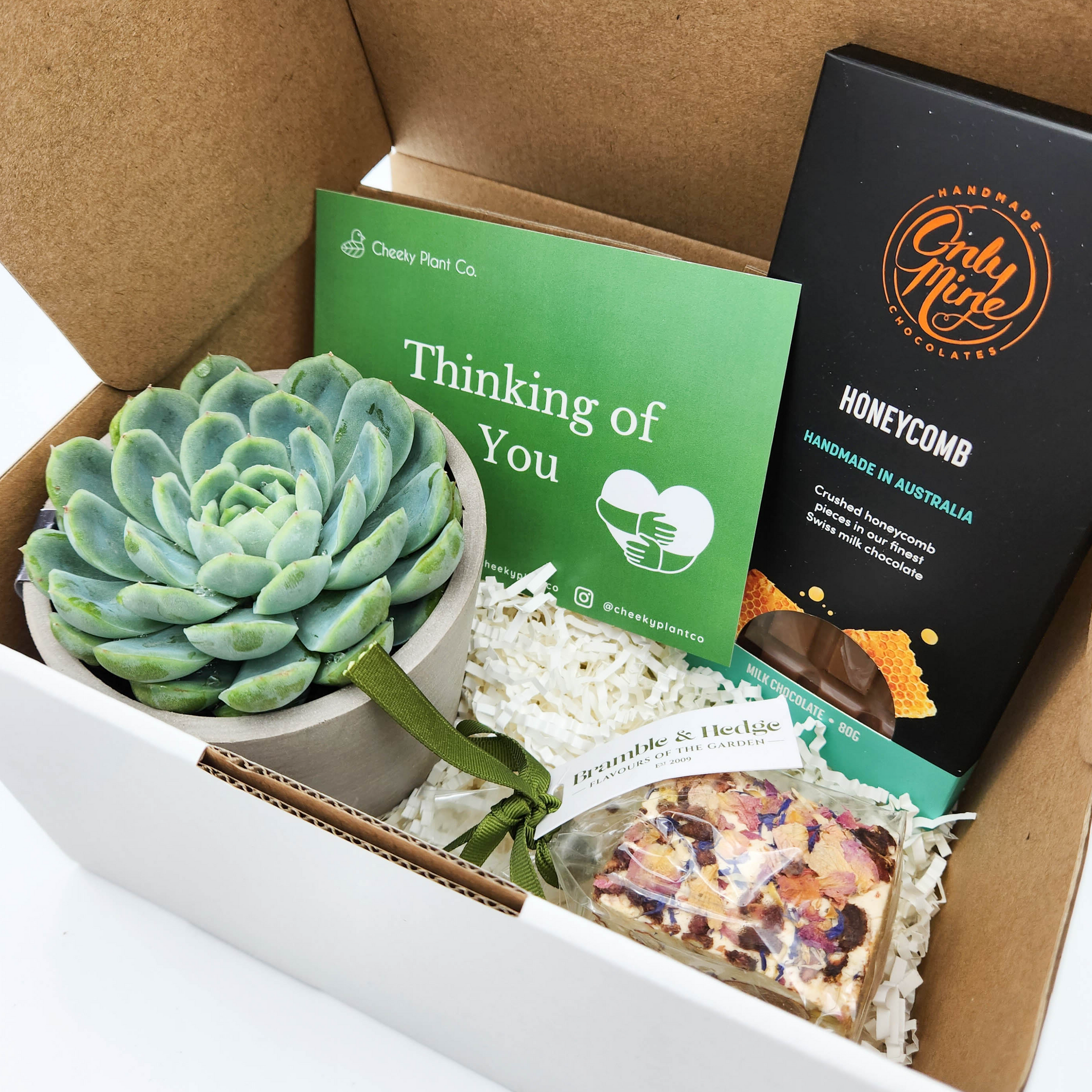 It’s hard to find the right words in difficult times. Show your support and care with this thoughtful Comforting Condolence Gift Box. The thoughtful selection of snacks consisting of nougat and chocolate, as well as a nurturing, low maintenance succulent, makes this a truly lovely way to say "I'm Thinking of You". It's the perfect way to show your loved ones that you are with them, that you care and are thinking of them.