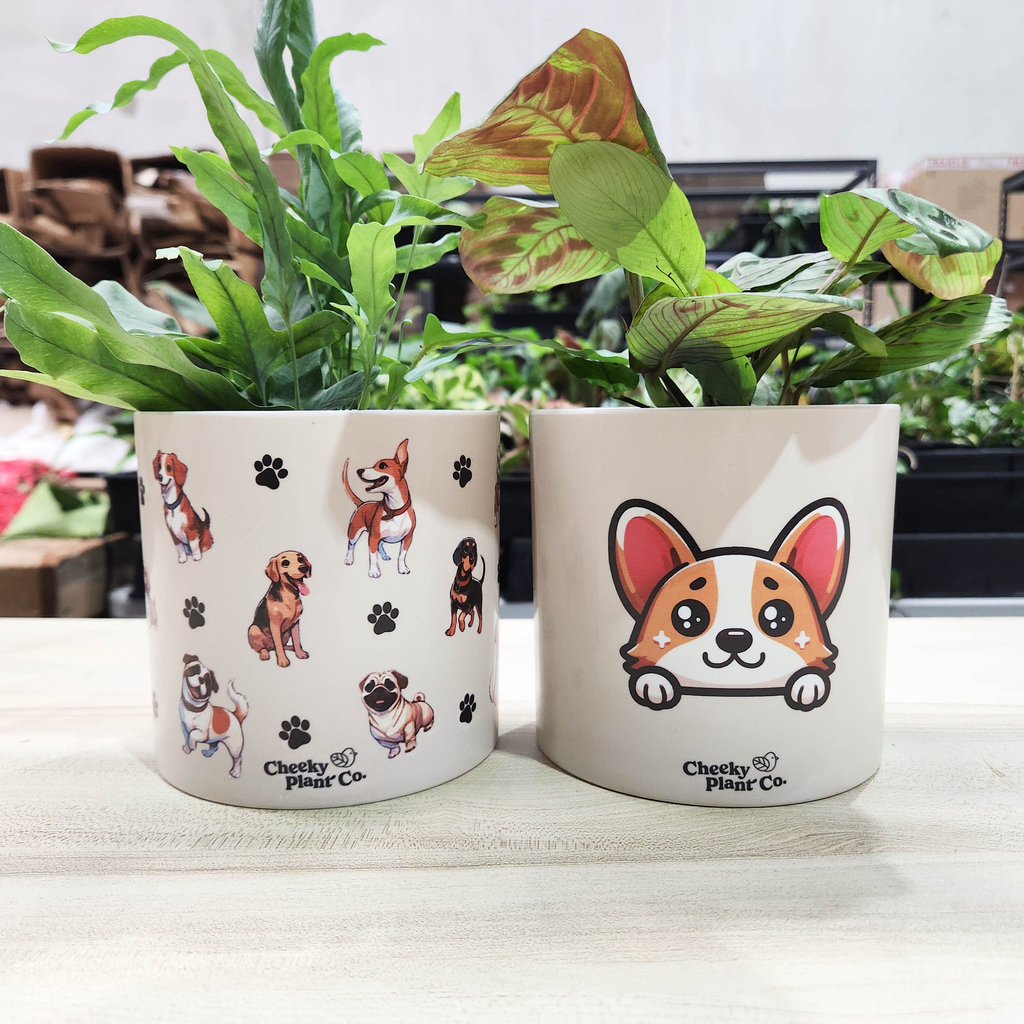 The Cute Dogs Duo Pack features the charming Corgi Dog and playful Cheeky Dogs Cheeky Plant Co. pots, perfect for dog lovers and plant parents alike. These adorable pet-themed pots add a dash of personality to any space and bring good vibes to your greenery. Great for your own home or as a gift for a fellow dog enthusiast.