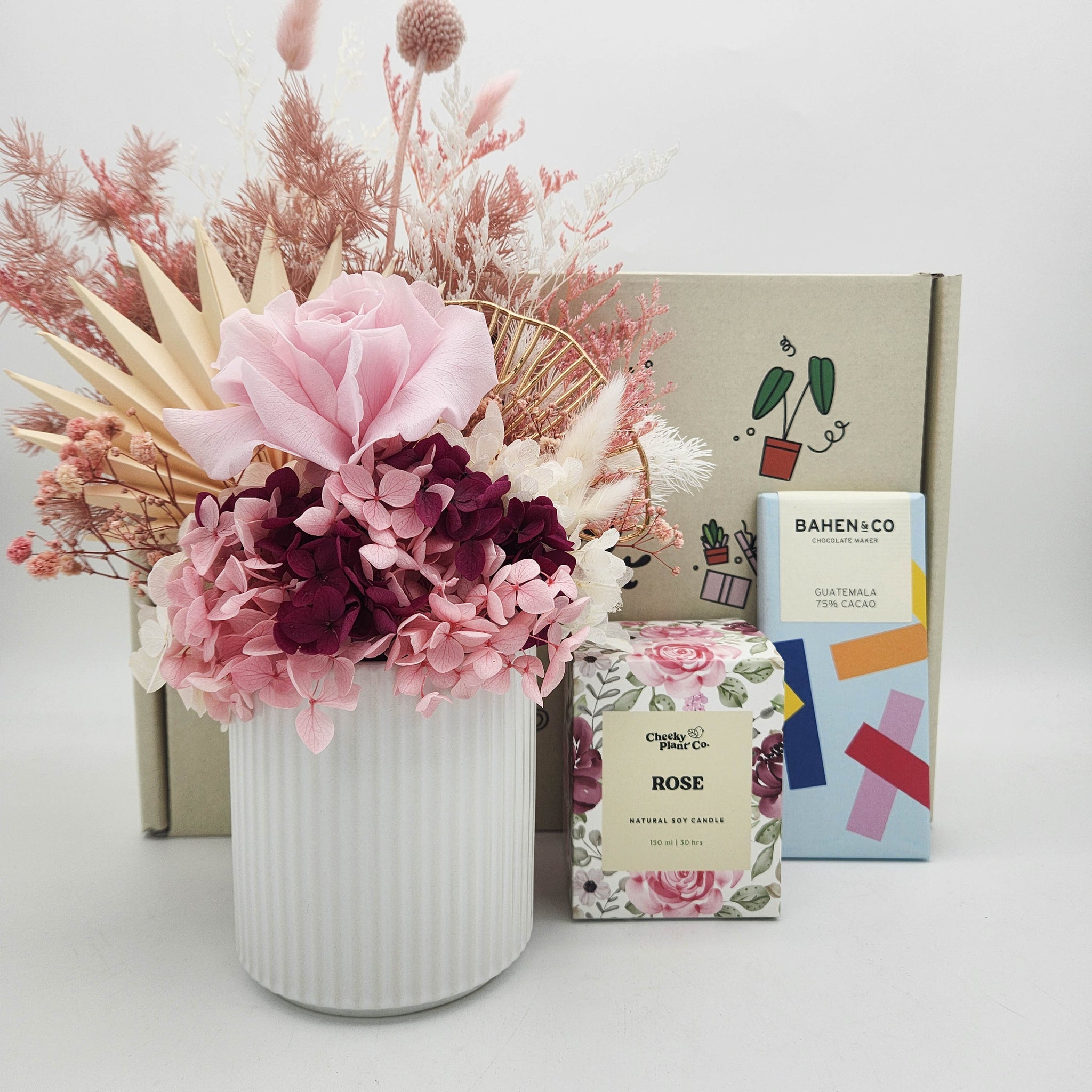 Each Birthday Pink Dried Floral Arrangement Gift Box contains: 1 x Pink Dried Flower Arrangement in a lovely white ribbed pot 1 x Bahen & Co Chocolate (randomly selected) 1 x Scented Candle - Rose 1 x Happy Birthday greeting card