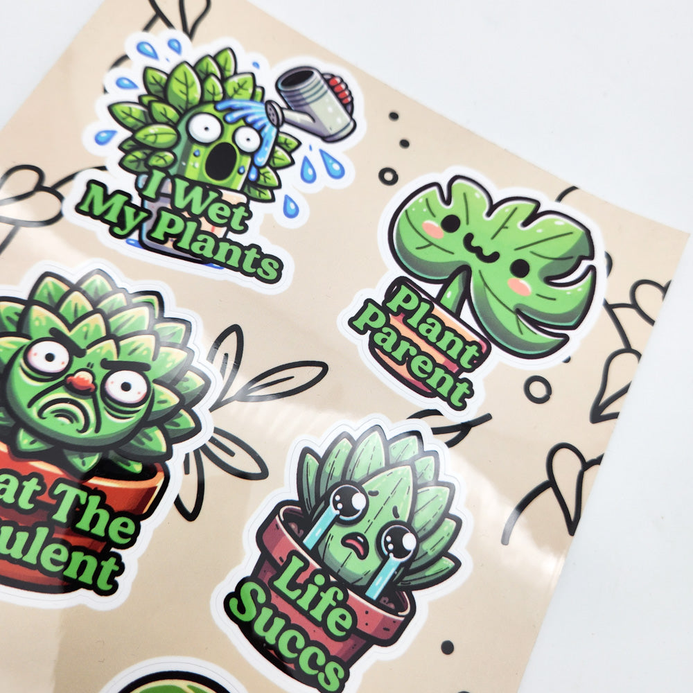 Each sticker set contains six stickers with the following designs: I Wet My Plants, Plant Parent, What The Fucculent, Life Succs, Pot Dealer and Talk Dirt To Me.