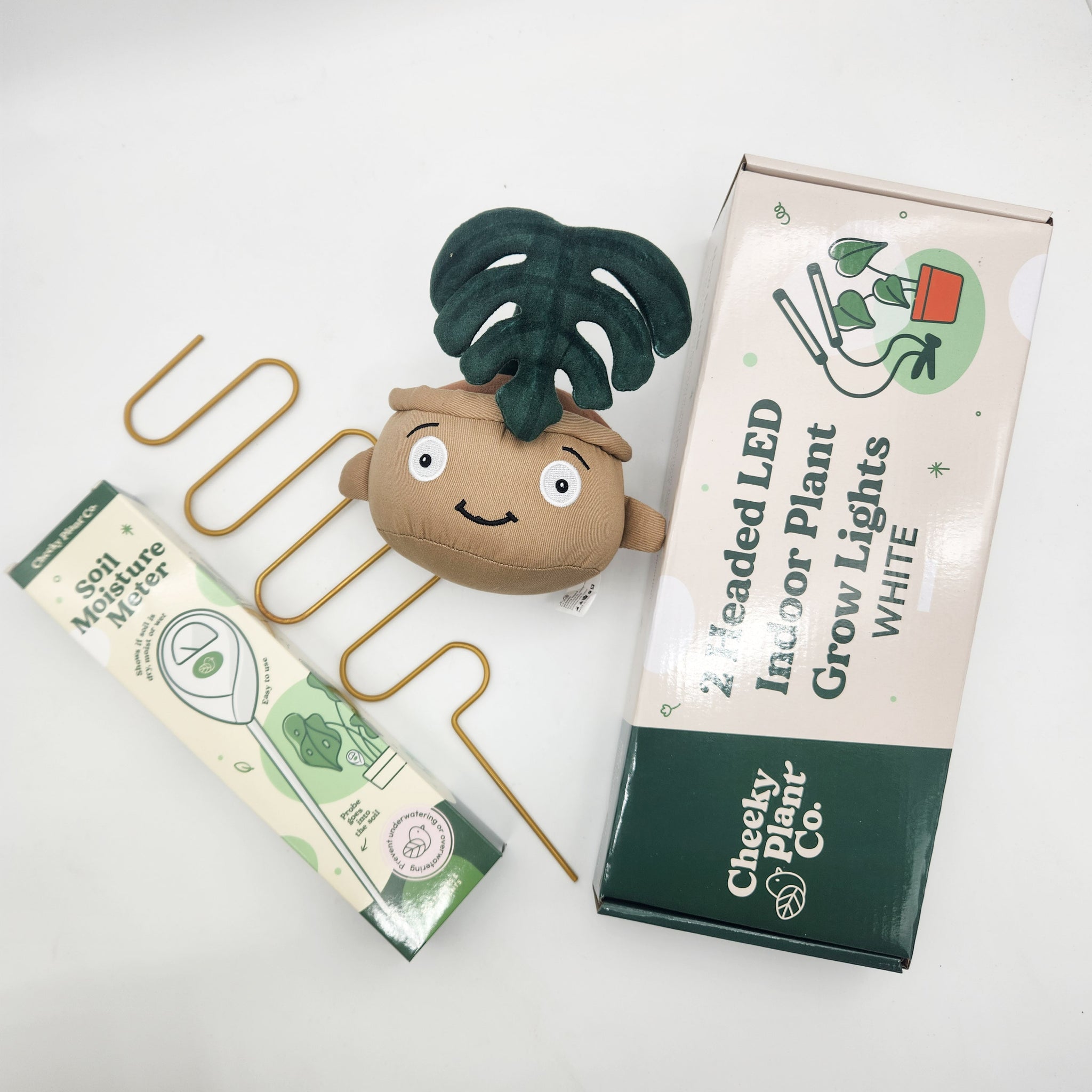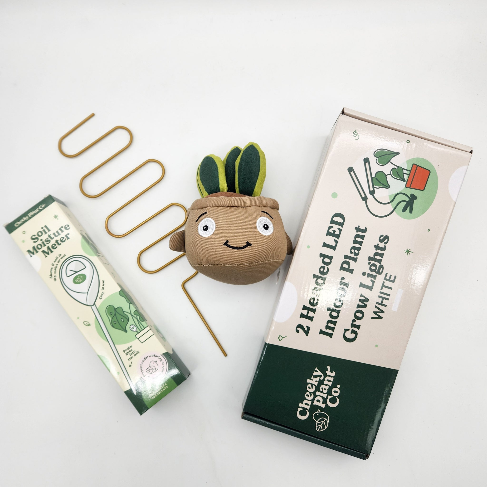 This pack features essential tools to easily check when your plants need watering, ensure they get the right light to grow strong, and provide climbing support with a beautiful gold wavy trellis. It also comes with a cute plant plushie companion of your choice - either a Monstera Plant Plushie or Snake Plant Plushie - to bring extra cheer to your plant corner.