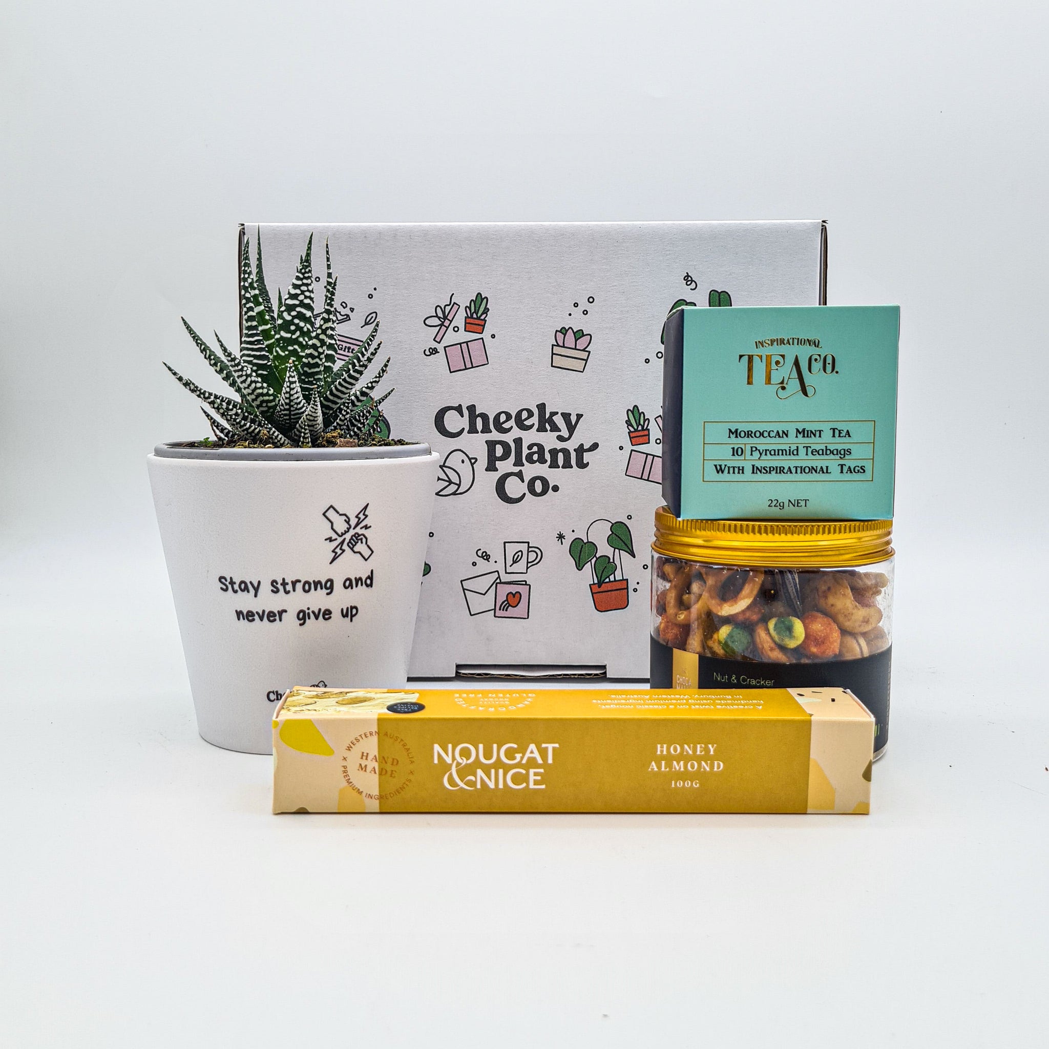 Discover the ultimate feel-good gift with the Positive Vibes - Succulent Gift Box. Featuring a succulent in a positive pot and delicious goodies, it's the perfect way to spread cheer and positivity in someone's life.