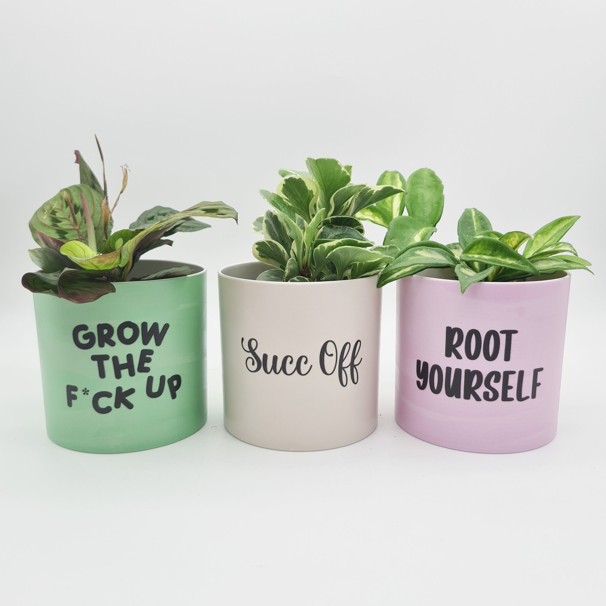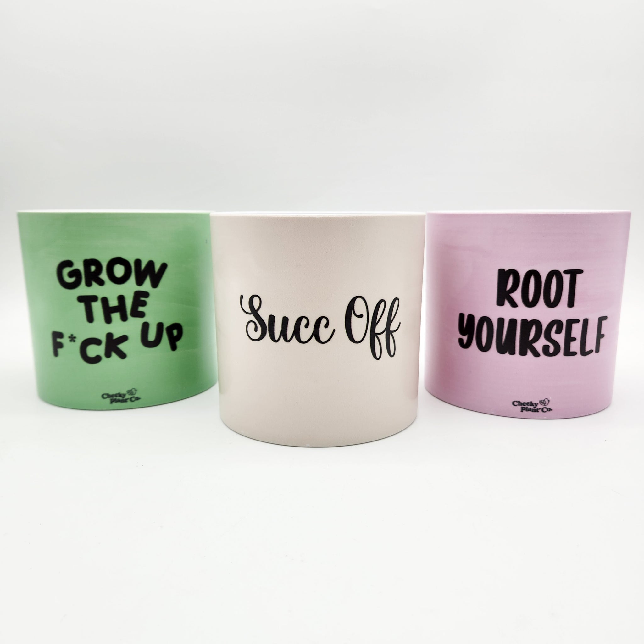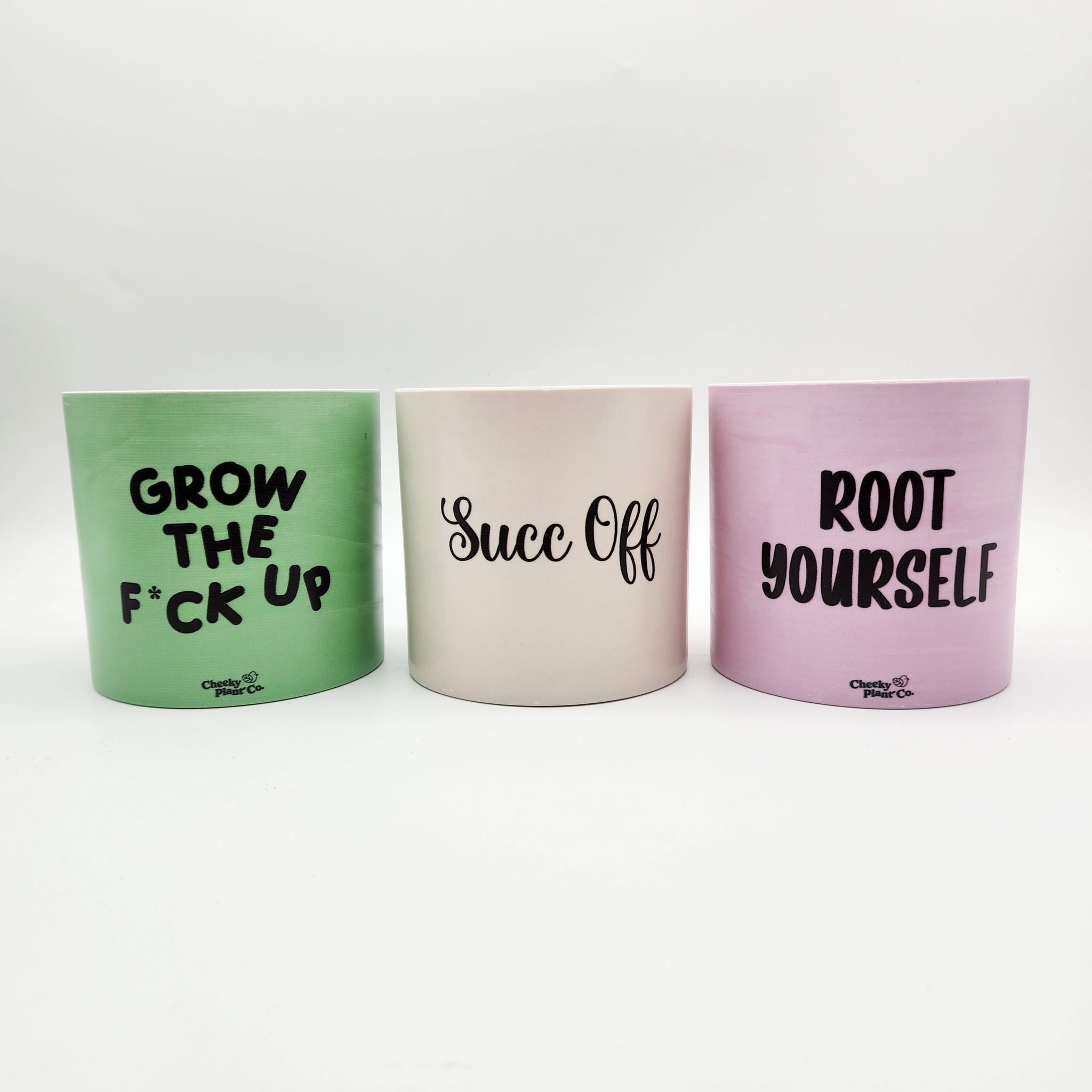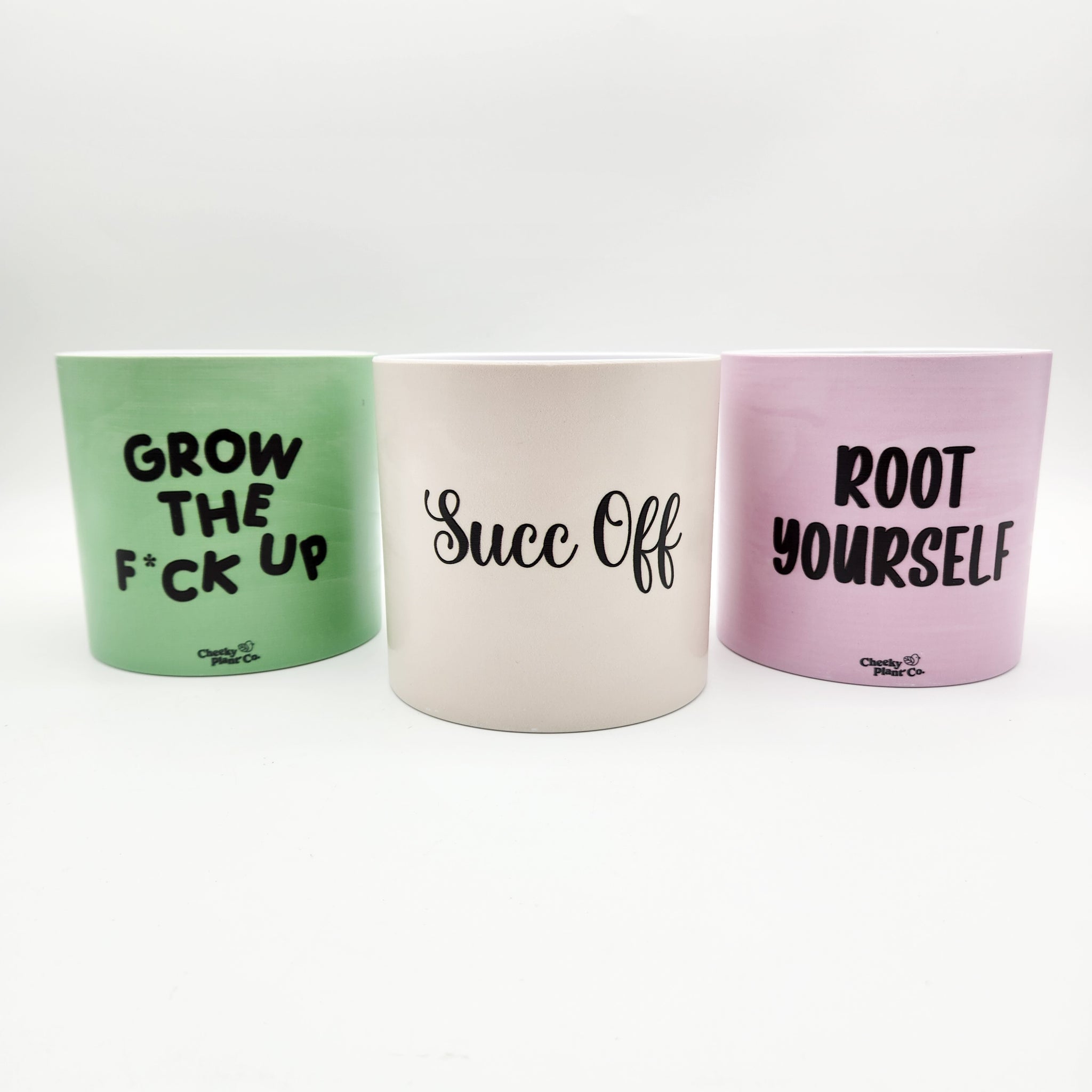 Transform your plant game with the Trio Succ It Up Pots Pack, featuring the Grow the Fck Up, Root Yourself, and Succ Off pots. Find your centre and stay grounded with the “Root Yourself” pot, designed for those who appreciate a strong foundation while keeping you connected to your roots. When you're over it, let the cheeky “Succ Off” pot do the talking, perfect for plant lovers with a sassy streak. For those ready to level up, the “Grow the Fck Up” pot brings tough love and a bold attitude to your display.
